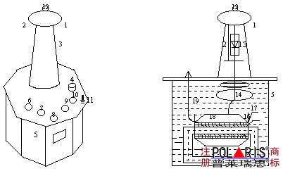 1-均压球;2-硅堆短路杆;3-高压套管;4-油阀;5-壳体;6、7-调整电压输入a、x端子;8、9-仪表测量E、F端子;10-高压尾X端子;11-变压器外壳接地端;12-高压输出A端子;13-高压整流硅堆;14-内部均压环;15-变压器铁芯;16-初级低压绕组;17-测量仪表绕组;18-次级高压绕组;19-变压器油。