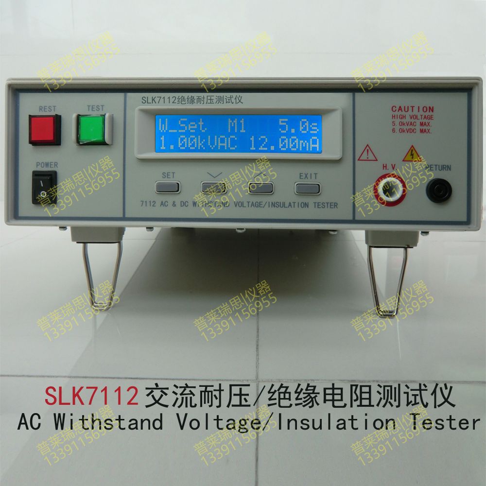 SLK7112程控耐压绝缘测试仪适用于家用电器、电源开关、电线电缆、变压器、接线端子、高压胶木电器、电机、医疗、化工、仪器仪表 (1)耐压范围0~5kV(AC)  (2)漏电流 0.10~12.00mA (3)绝缘电阻:1-1000MΩ (4)准确度:± 2% ≥500V DC ±5%<500V DC (5)绝缘电阻:1000-9999MΩ (6)准确度:±5% ≥500V DC ±10%<500V DC (7)电流上下限设定 (8)前面板软件校 正 (9)LCD液晶显示、菜单引导操作 (10)具有电弧侦测功能(1-9级) (11)键盘锁定功能 (12)5组测量记忆模式 (13)测试时间、电压、电流、电阻同时显示 (14)PLC 、RS232接口,可选配电脑软件,另配置扫描仪,实现光伏组件的高效率测试.