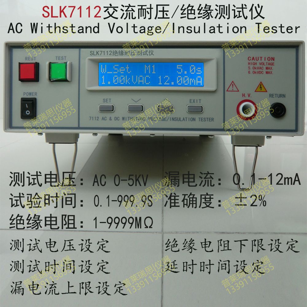SLK7112程控耐压绝缘测试仪适用于家用电器、电源开关、电线电缆、变压器、接线端子、高压胶木电器、电机、医疗、化工、仪器仪表 (1)耐压范围0~5kV(AC)  (2)漏电流 0.10~12.00mA (3)绝缘电阻:1-1000MΩ (4)准确度:± 2% ≥500V DC ±5%<500V DC (5)绝缘电阻:1000-9999MΩ (6)准确度:±5% ≥500V DC ±10%<500V DC (7)电流上下限设定 (8)前面板软件校 正 (9)LCD液晶显示、菜单引导操作 (10)具有电弧侦测功能(1-9级) (11)键盘锁定功能 (12)5组测量记忆模式 (13)测试时间、电压、电流、电阻同时显示 (14)PLC 、RS232接口,可选配电脑软件,另配置扫描仪,实现光伏组件的高效率测试.