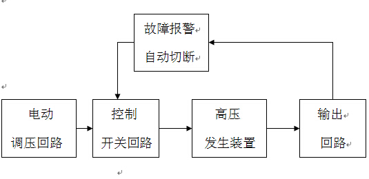 仪器接通电源后,通过按“升压” 或 “降压”控制按钮调节电动调压器的输入端,从而产生0~35kV高压输出。