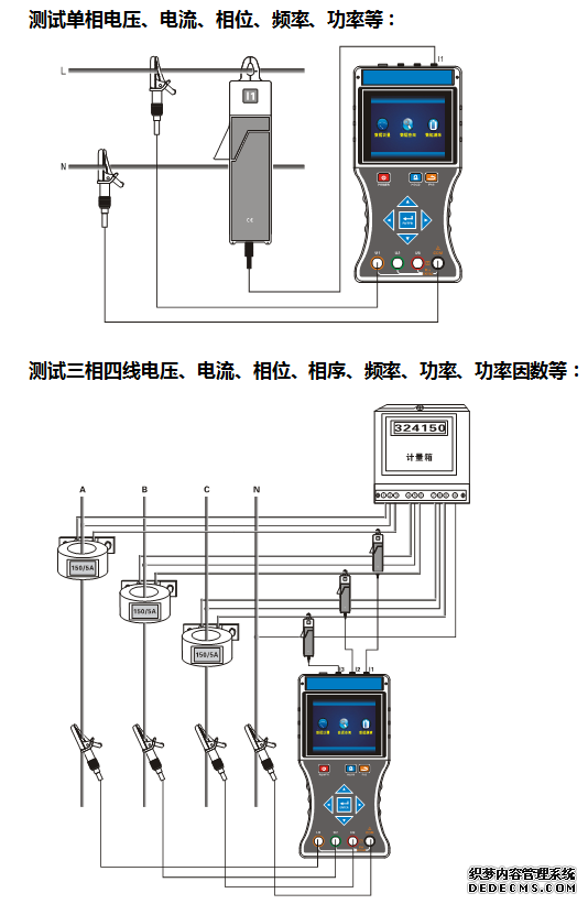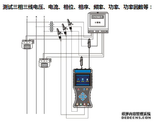 同时测试三相380V/220V电力系统中的电流、电压、相位、频率、相序、有功功率、无功功率、视在功率、功率因素、电流矢量和,判别变压器接线组别、感性、容性电路,测试二次回路和母差保护系统,读出差动保护各组CT之间的相位关系,检查电度表的接线正确与否,检修线路设备等 |