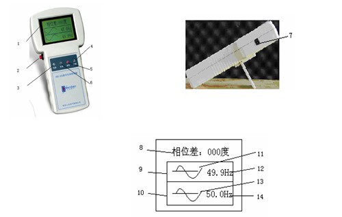 接受器为手持式仪器,带有内置天线,用于接收发射器发送过来的高压信号。接收到发射器发射的相位信号后,经分析处理后,将频率、电压波形和相位差显示在LCD上。
