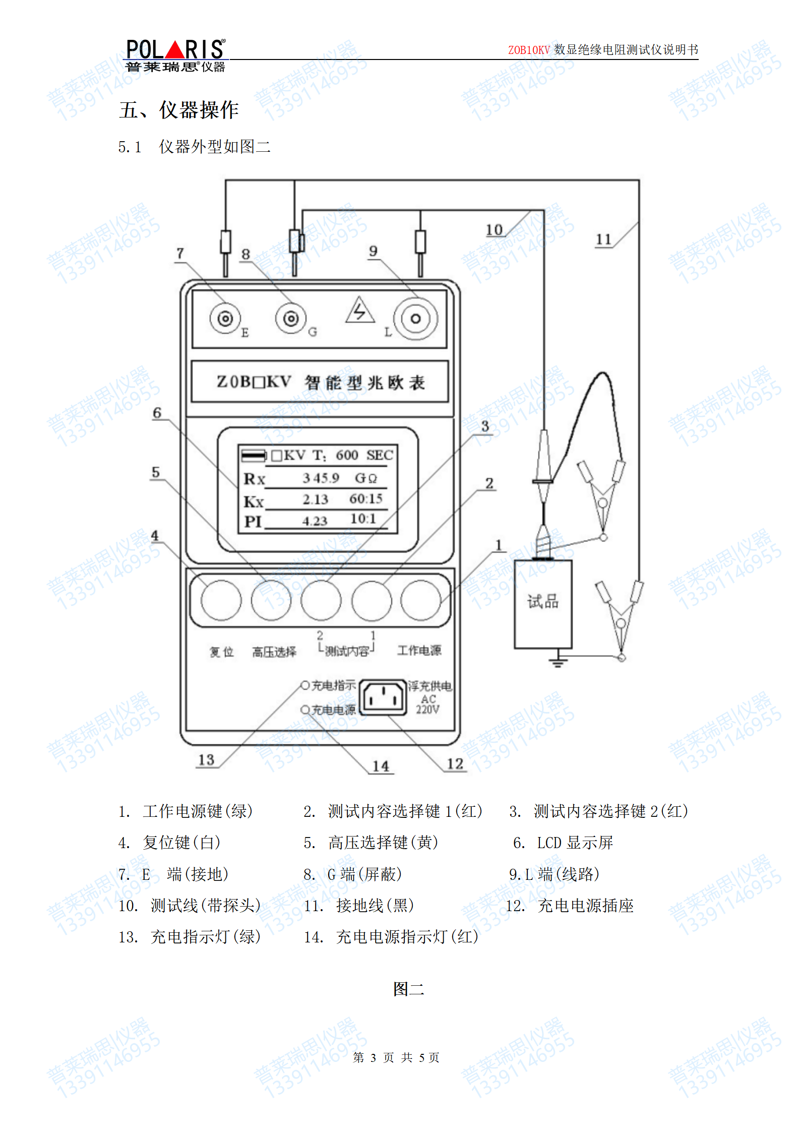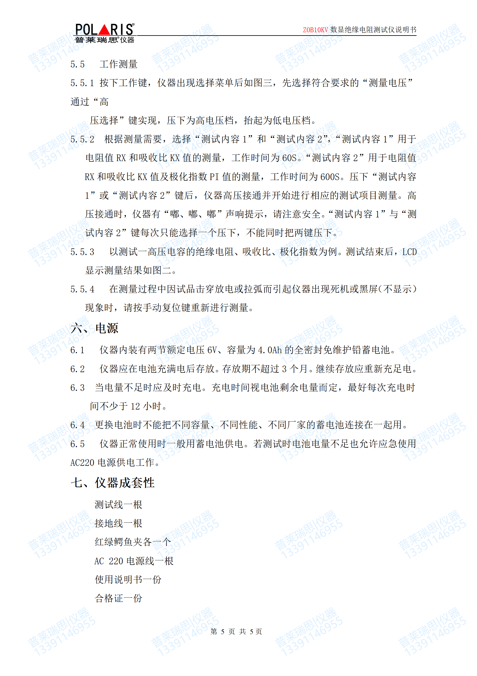 | 附件 :铝合金(5000V/10000V)或工程塑料(5000V以下)包装箱,(8节1.5V五号碱性电池,测试导线,产品说明合格证)各一份,测试线2根,高压线棒(连在表上)1付; | ||||||